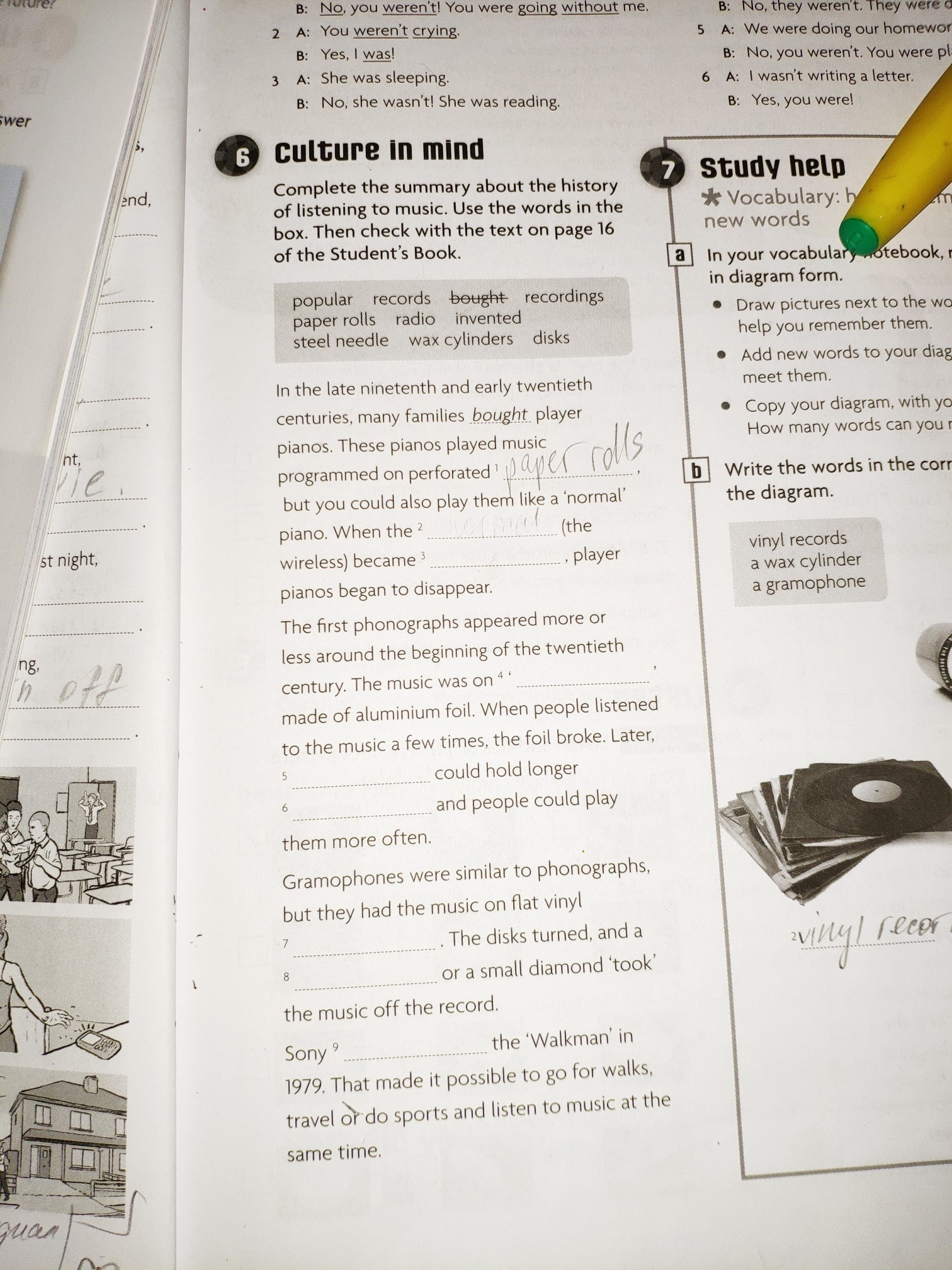1. paper rolls 2 . radio 3. popular 4. wax cylinders 5. recording 6. records 7. disks 8. steel needle 9. invented