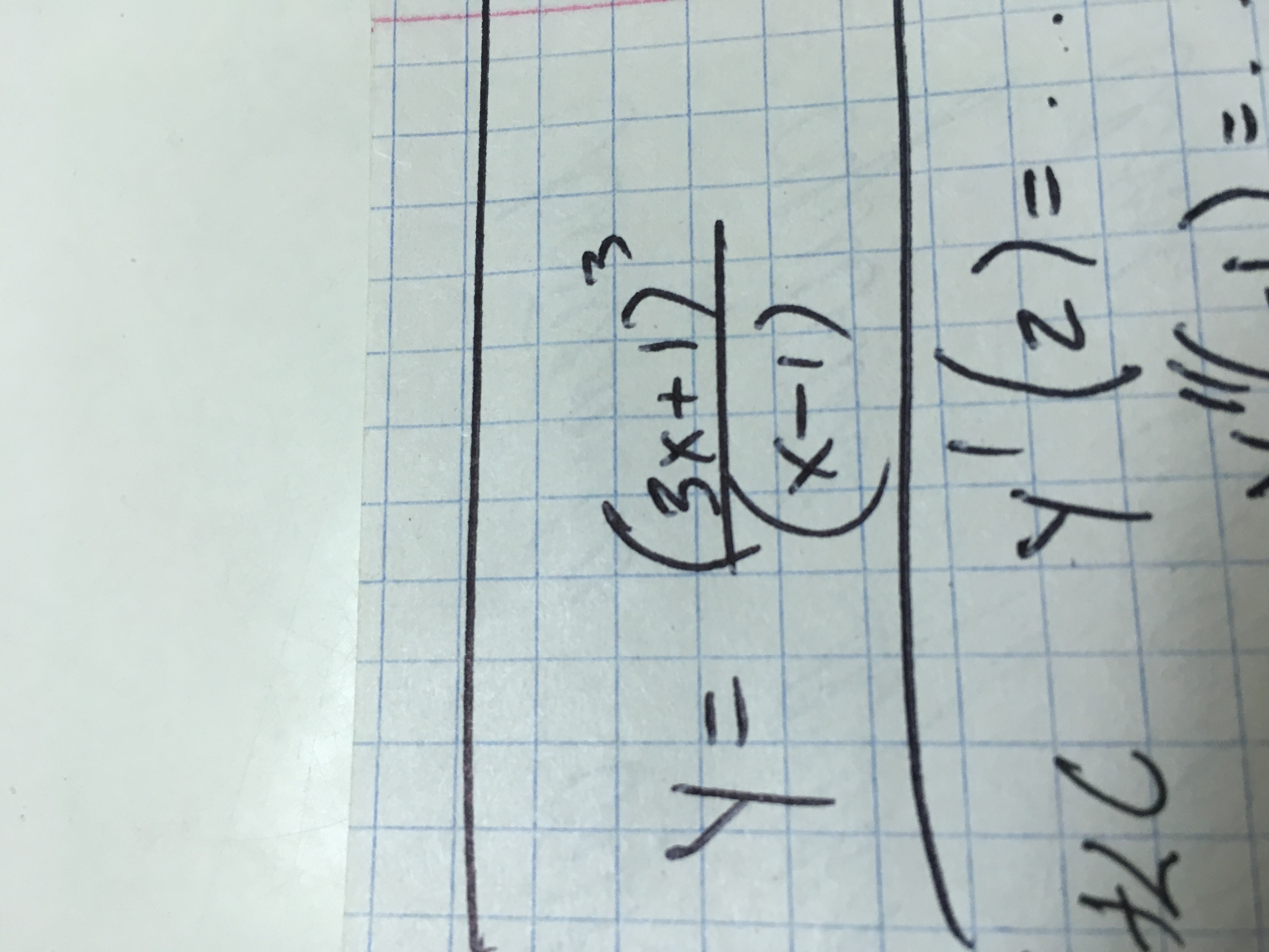 y`=frac{((3x+1)^3)`(x-1)-(3x+1)(x-1)`}{(x-1)^2}=frac{9(3x+1)^2(x-1)-(3x+1)^3}{(x-1)^2};\y`(2)=frac{9*49-7*49}{1^2}=98;