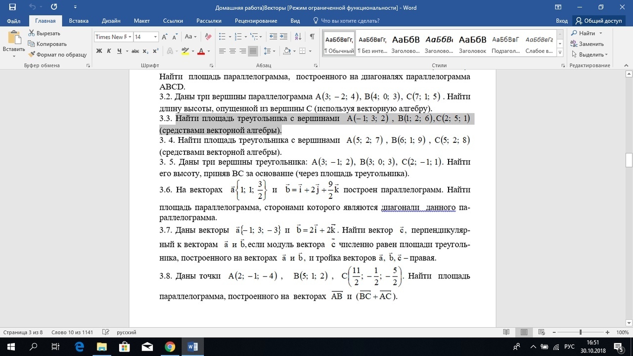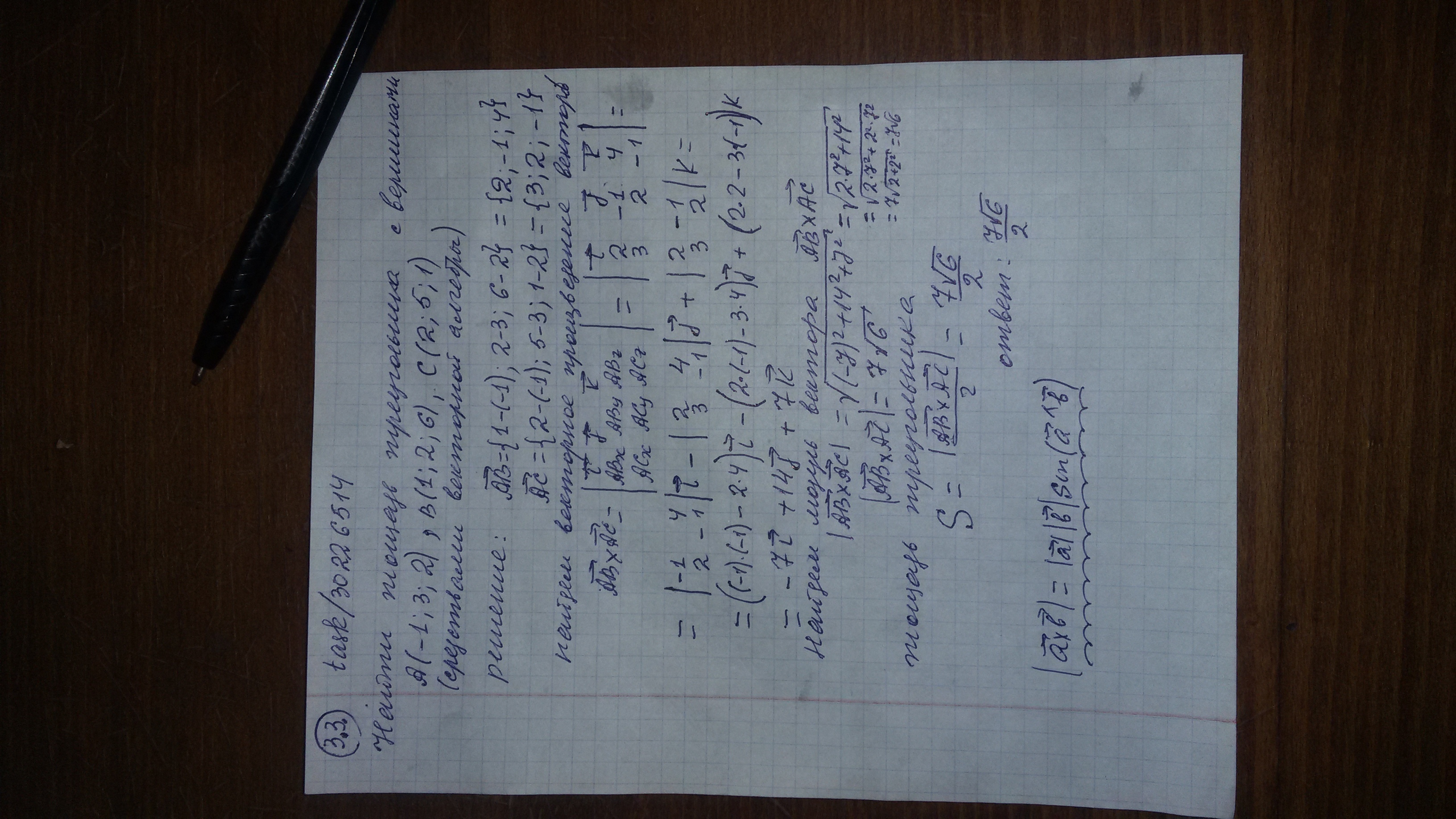 task/30226514 Средствами векторной алгебры найти площадь треугольника с вершинами A(-1; 3; 2) ,B(1;2 ;6) ,C( 2; 5; 1)