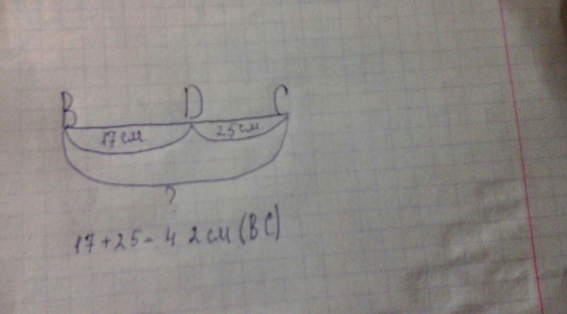 Три точки В, С и D лежат на одной прямой.Известно,что BD=17 см, DC= 25 см.Чему может быть равна длина отрезка ВС?