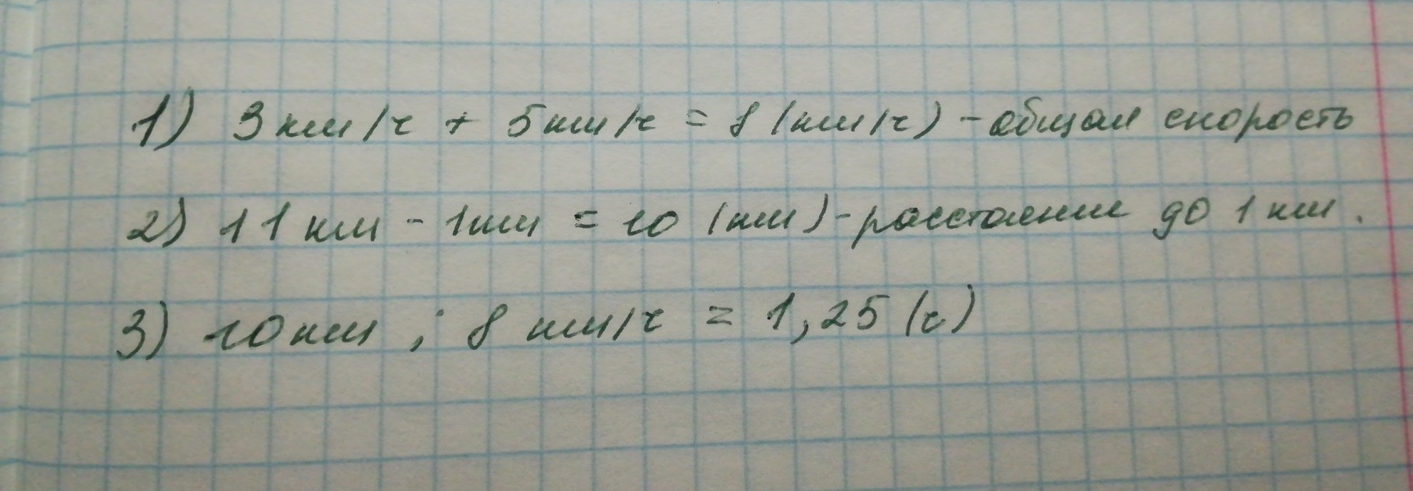 Из пункта а и в расстояния между которыми 11км одновременно вышли 2пешехода один двигался со скоростью 3км/ч а второй 5км/ч через какое время после встречи расстояние между пешеходами будет 1км