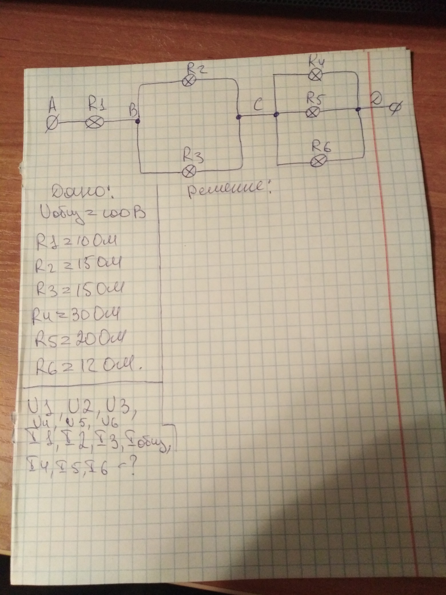 R23=15/2=7.5 Om, R456=30*20*12/(30*20+ 20*12+30*12)= 6 Om, Rобщ= 10+7.5+6=23.5 Om, Iобщ=I1=100/23.5=0.4255A, U2=U3=7.5*0.4255=3.19V, I2=I3=3.19/15=0.21A, U4,5,6=0.4255*6=2.553V, I4=2.553/30= 0.085A, I5=128A, I6=0.213A