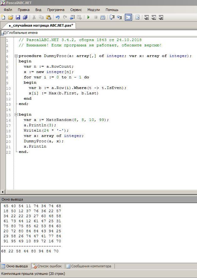 Дана целочисленная квадратная матрица порядка n(n=8). Получить элементы массива x равные максимальному среди первого и последнего четного элемента очередной строки матрицы. Считать, что четных элементов в каждой строке больше двух
