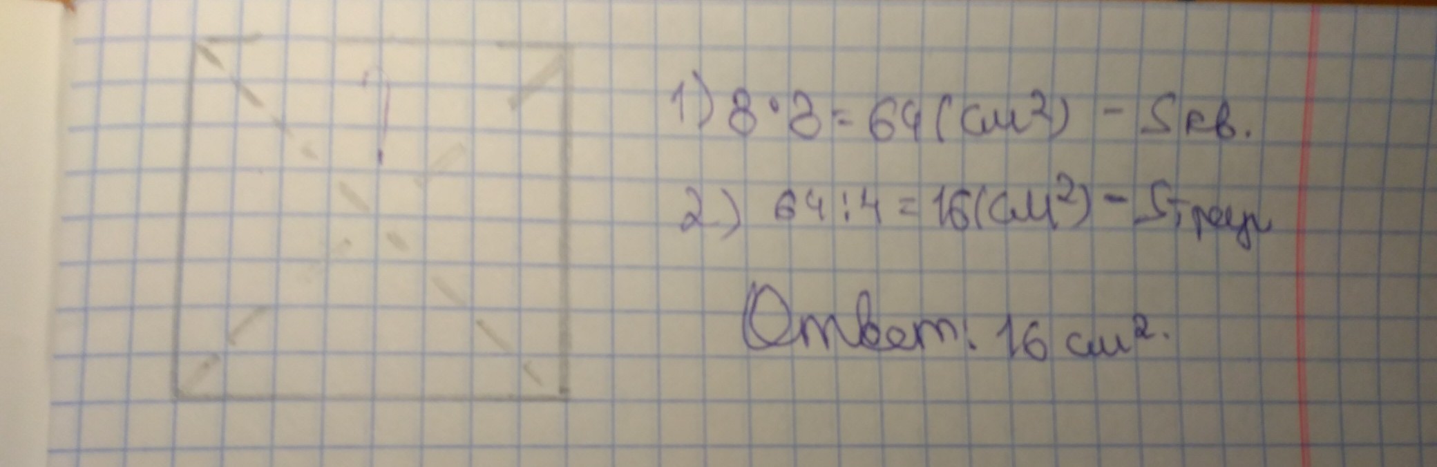 Лист бумаги квадратной формы со стороной 8 см разрезали на четыре равных треугольника. Найди площадь одного треугольника