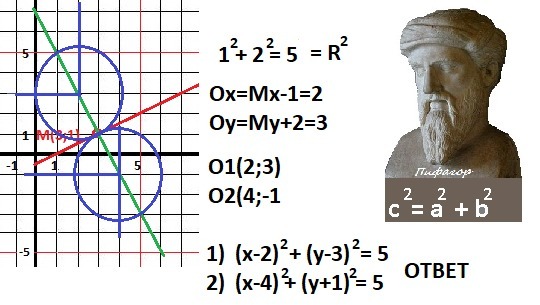 Уравнение окружности: (x-a)² + (y-b)² = R² = 5. (R ≈ 2.24) - надо найти координаты центра окружности - О(a,b)