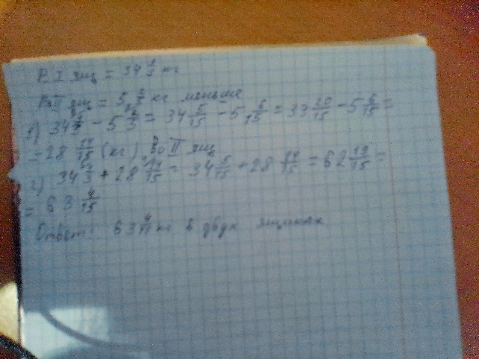 в одном ящике 34 1/3 кг яблок что на 5 2/5 кг больше чем в другом ящике Сколько килограммов яблок в двух ящиках