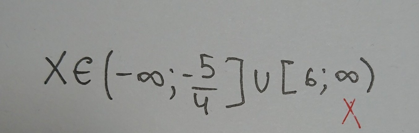 Ответ: х∈(-∞; -1,25]U{6: +∞)