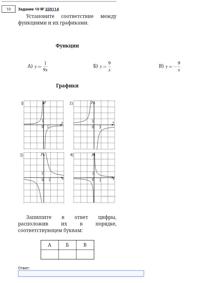 Ответы А4 Б3 В2. Чем больше знаменатель, тем ближе гипербола к осям. Также по знаку можно определить, в каких координатных осях лежит график