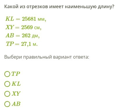 По нашим переводам можем сделать вывод 27,1 м>26,2 м>25,69 м>25,681 м, т.е. TP>AB>XY>KL. Из этого следует что наименьшим отрезком является KL
