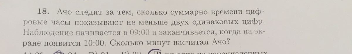 С 09-00 до 09-09 все 10 мин будут 2 нуля. Берем остальные промежутки по 10 мин, их будет 5. Внутри каждого будут минуты с 0 и с 9, а также с одинаковыми минутами, например, 09-20, 09-29, 09-22. Итого в каждой десятиминутке по 3 минуты. 3*5=15, всего 15+10=25 минут