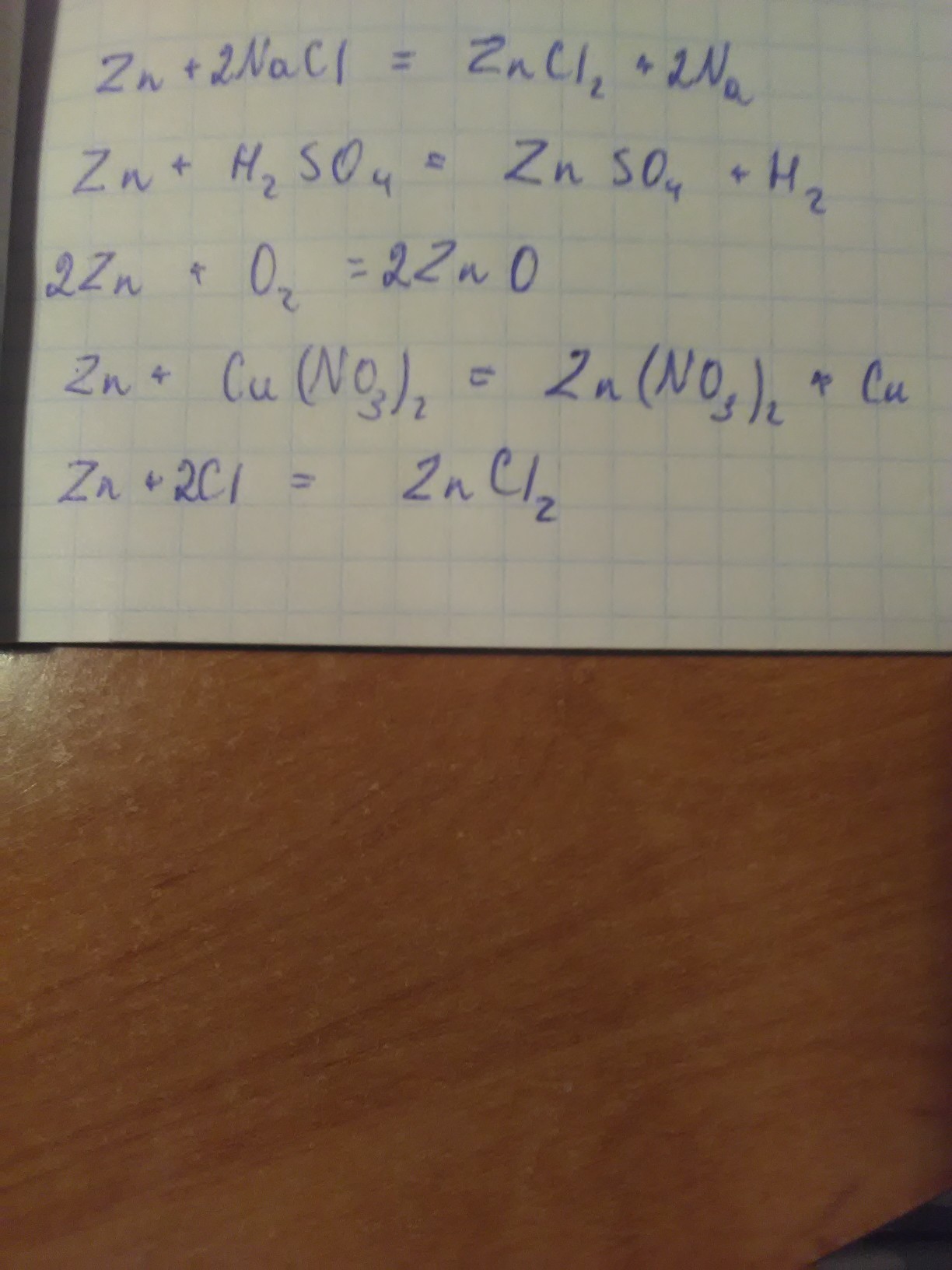 С какими из перечисленных веществ будет реагировать цинк? Напиши уравнения возможных реакций. Расставь коэффициенты. Назови полученные вещества. Вещества: хлорид натрия, серная кислота, кислород, нитрат меди(2), сера, хлор.