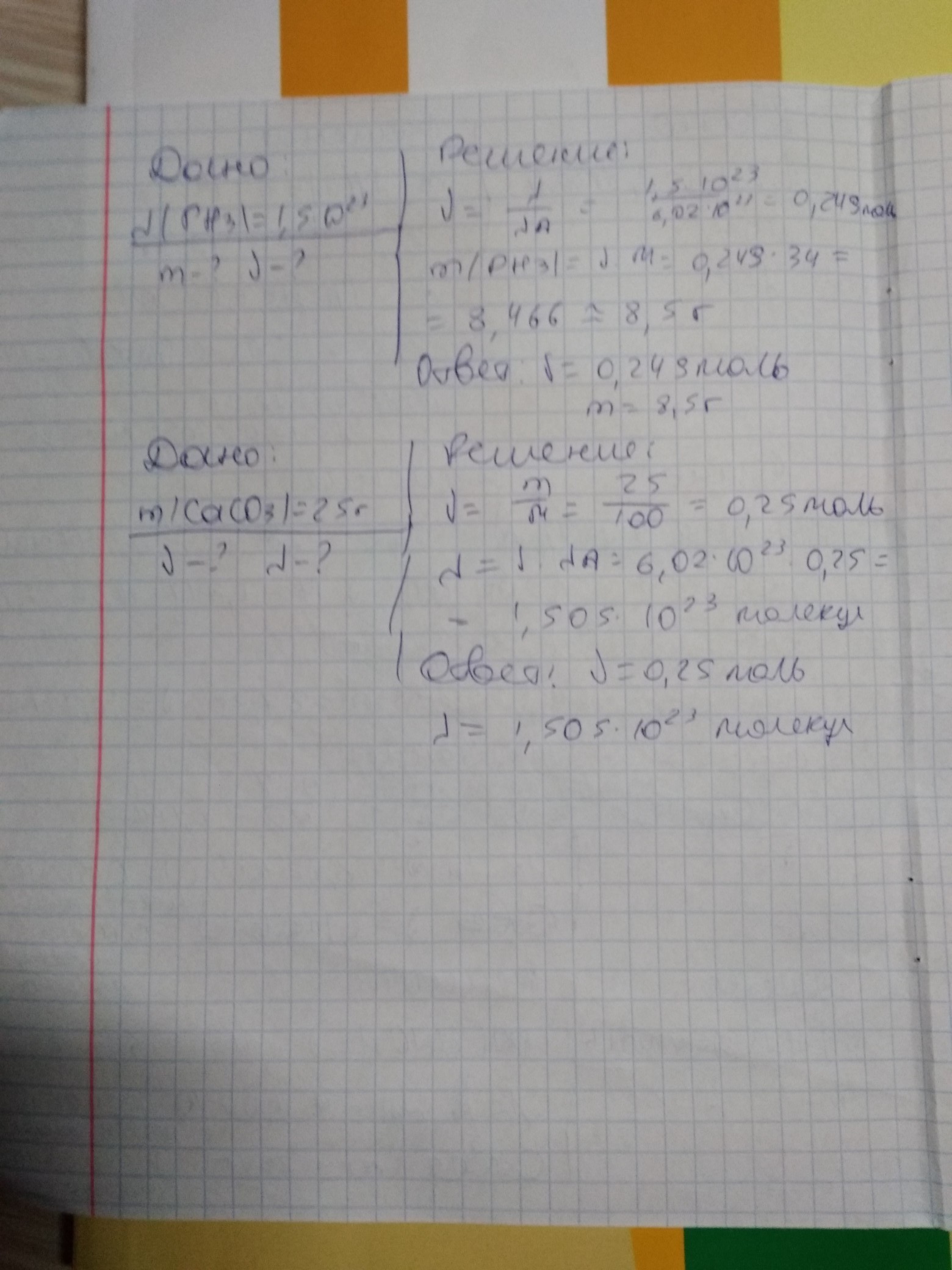 n(PH3)= 1.5×10^23 : 6.02×10^23= 0.25моль