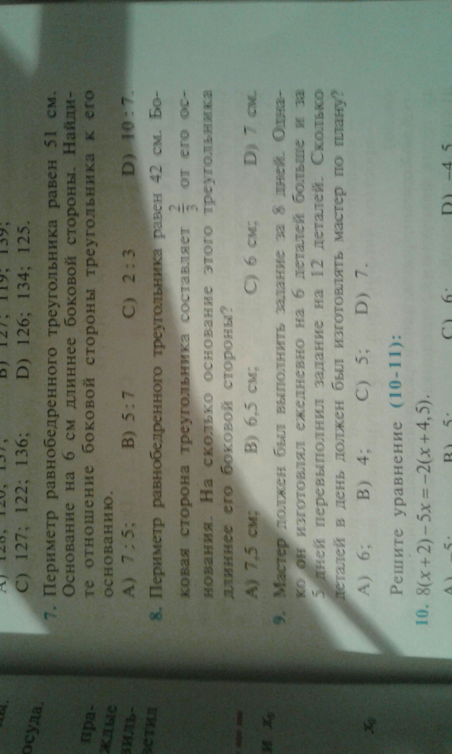 8) Боковая сторона относится как 2:3 к основанию. 2*2доли боковых сторон + 3 доли основания составляют периметр. Доля равна 42:(2*2+3)=6см. Боковая равна 2долям 2*6=12, основание 3 долям 3*6=18.