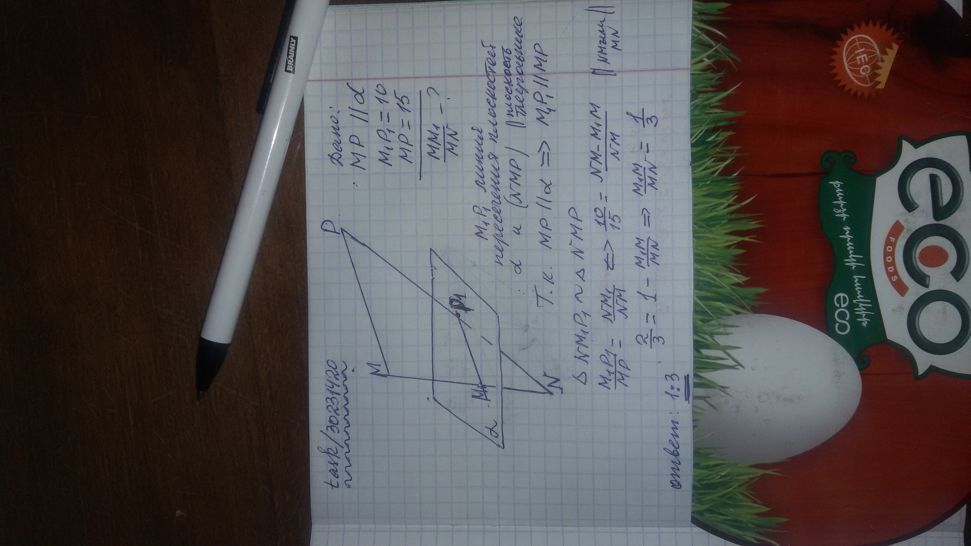 плоскость параллельная стороне МР треугольника МNP пересекает стороны MN и NP в точках М1 и Р1 соответственно найдите отношение ММ1 к МN если M1P1=10,MP=15