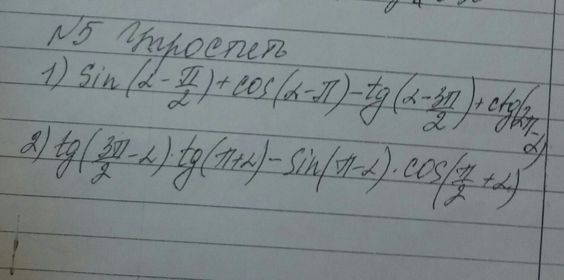1) sin(alpha-frac{pi}2) + cos(alpha - pi) - tg(alpha - frac{3pi}2) + ctg(2pi - alpha) = \-cosalpha - cosalpha - ctgalpha - ctgalpha = -2(cosalpha + ctgalpha)\2) tg(frac{3pi}2 - alpha)tg(pi + alpha) - sin(pi-alpha)cos(frac{pi}2 + alpha) = ctgalpha tgalpha + sinalpha sinalpha = sin^2alpha + 1