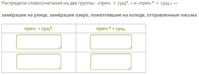 Прич. + сущ*. : Замёрзшее озеро, отправленные письма.