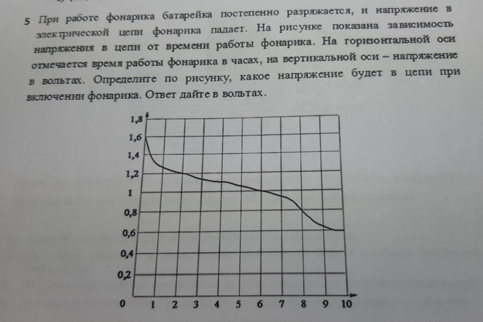 По условию, при работе батарейка постепенно разряжается, следовательно, по графику оно идёт вниз. Максимальное значение - 1,6, значит при включении фонарик будет иметь напряжение, равное 1,6 Вольт.