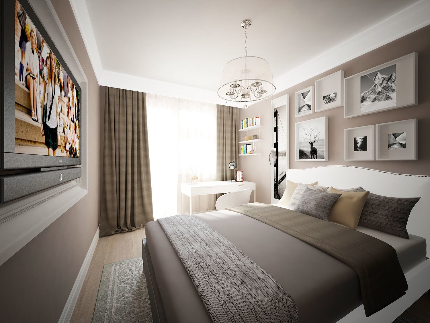 Над кроватью и перед ней, висят не большие картины.Лампа тоже висит над кроватью. Размером она крупная и видно, что будет светить ярко. Стены светлые и потолок тоже