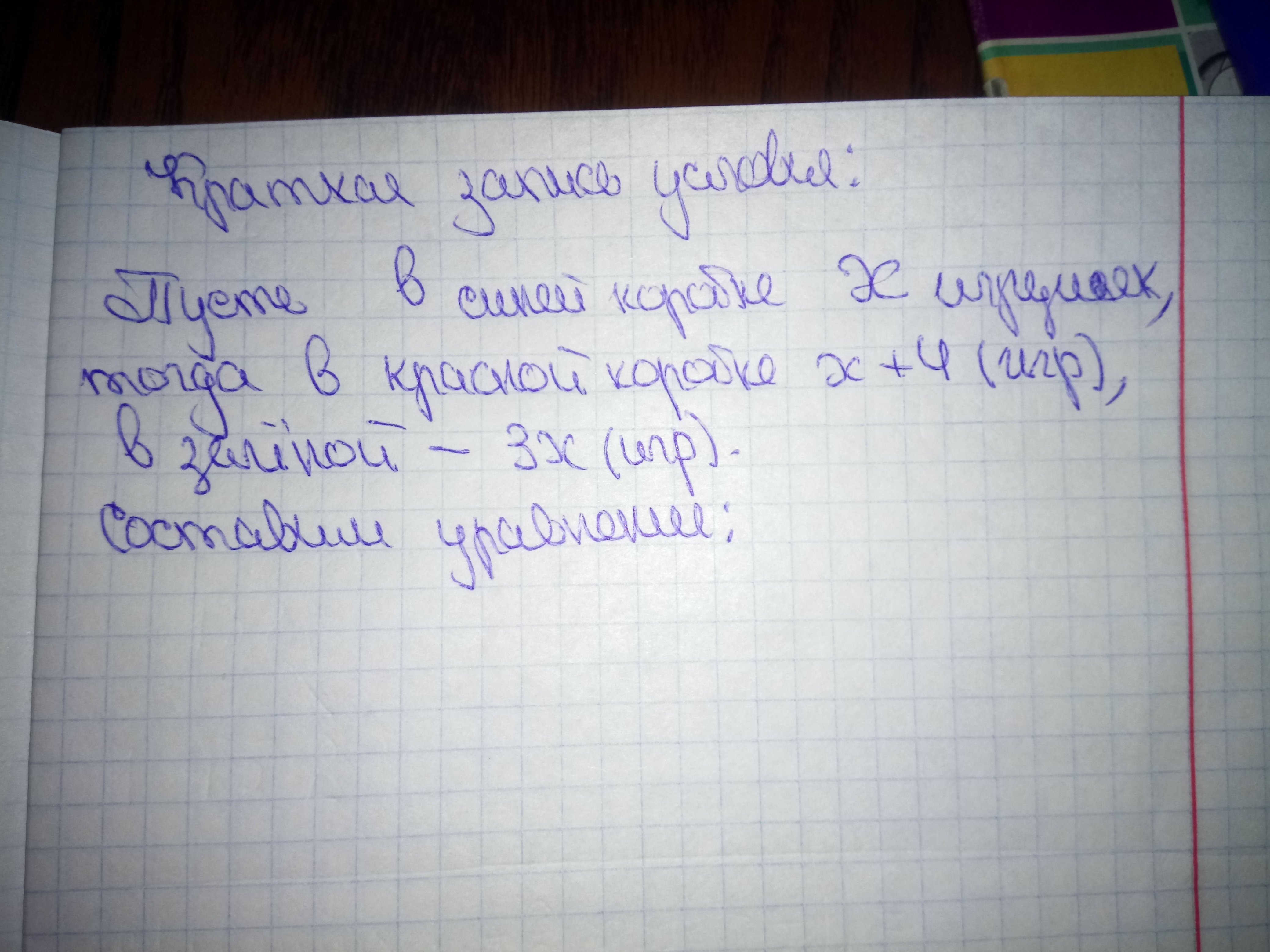 в красной коробке на 4 игрушки больше чем в синей а в зеленой коробке игрушек в 3 раза больше чем в синей сколько игрушек в каждой коробке если всего их 24