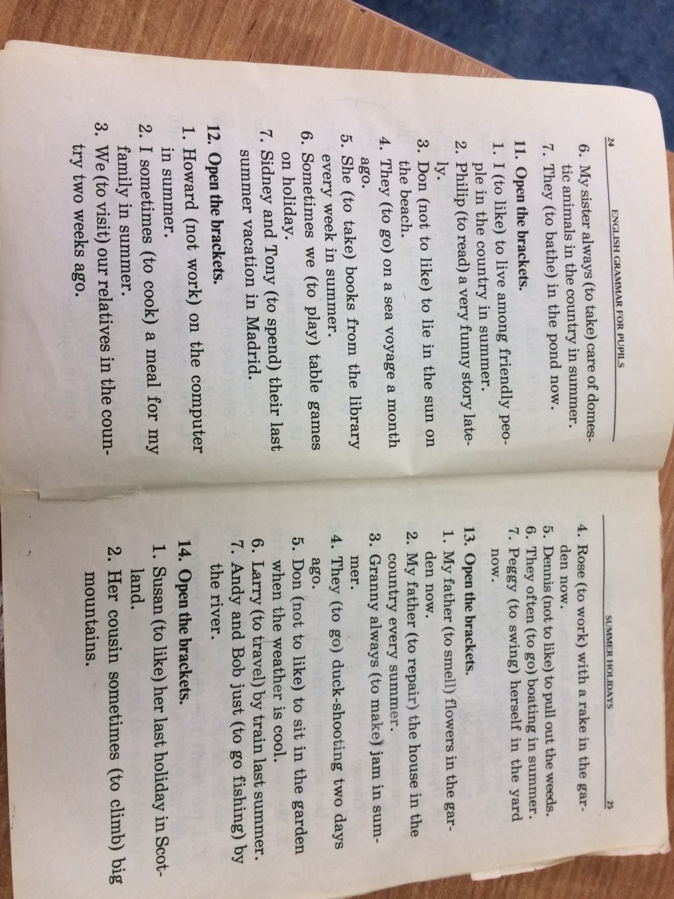 6. Моя сестра всегда (берет) заботу о куполах. 4. Роза (для работы) с граблями на животных в стране летом 7. Они (купаться) в пруду сейчас. 11. Откройте скобки. 1. Мне (нравится) жить среди дружественных людей сейчас 5. Deunis (oot to lilke), чтобы вытащить сорняки. 6. Они часто (кататься) катаются на лодке летом. 7. Пегги (чтобы повидаться) сама во дворе. летом в стране. 2. Филипп (чтобы прочитать) очень забавную историю поздно 13. Откройте скобки. 1. Мой отец (понюхать) цветы в гардере 3. Дон (не нравится) лежать на солнце на пляже. 4. Они (идти) в морское путешествие через месяц. 2. Мой отец (отремонтировать) дом в прошлом. 5. Она (брать) книги из страны библиотеки каждое лето. 3. Бабушка всегда (чтобы сделать) варенье в сумме mer каждую неделю летом 6. Иногда мы играем в настольные игры 4. Они (чтобы пойти) ути-стрельбы два дня назад. 5. Дон (не нравится) сидеть в саду в отпуске, когда погода прохладная. 6. Ларри (на поезде) на поезде прошлым летом 7. Энди и Боб только (чтобы пойти на рыбалку) на 7. Сидни и Тони (чтобы провести) свои последние летние каникулы в Мадриде. 12. Откройте скобки. река. 1. Говард (не работает) на компьютере 2. Я иногда (готовлю) еду для своего 8. Мы (чтобы посетить) наших родственников в стране. 14. Откройте скобки. 1. Сьюзан (пожалуй) свой последний отпуск в Скотти - летом. и семья летом. 2. Ее двоюродный брат иногда (чтобы вырезать) большую попытку две недели назад. горы