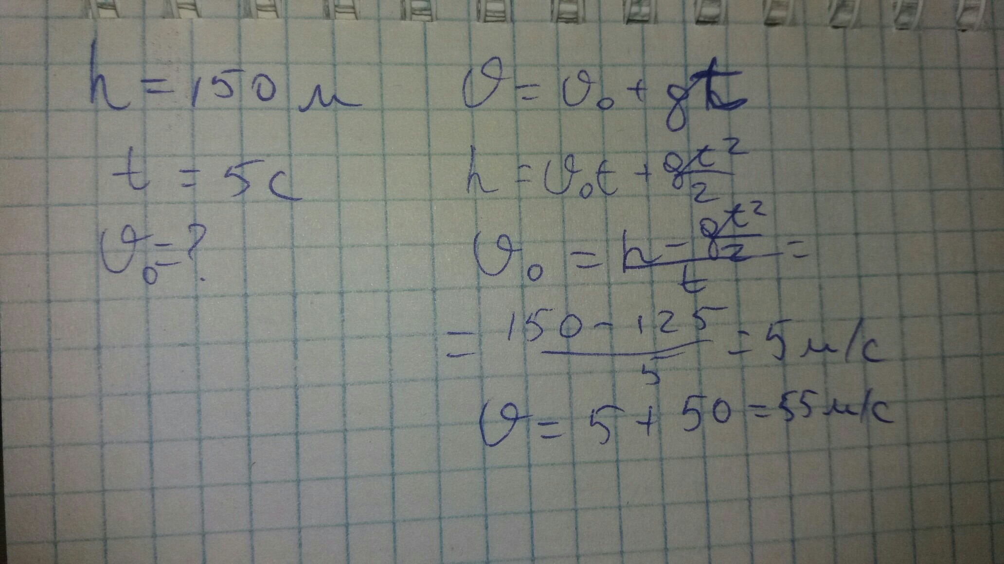 Мяч бросили вертикально вниз с высоты 150 м с какой скоростью бросили если мяч упал через 5 секунд какую скорость он приобрел в конце пути? С какой скоростью его бросили?