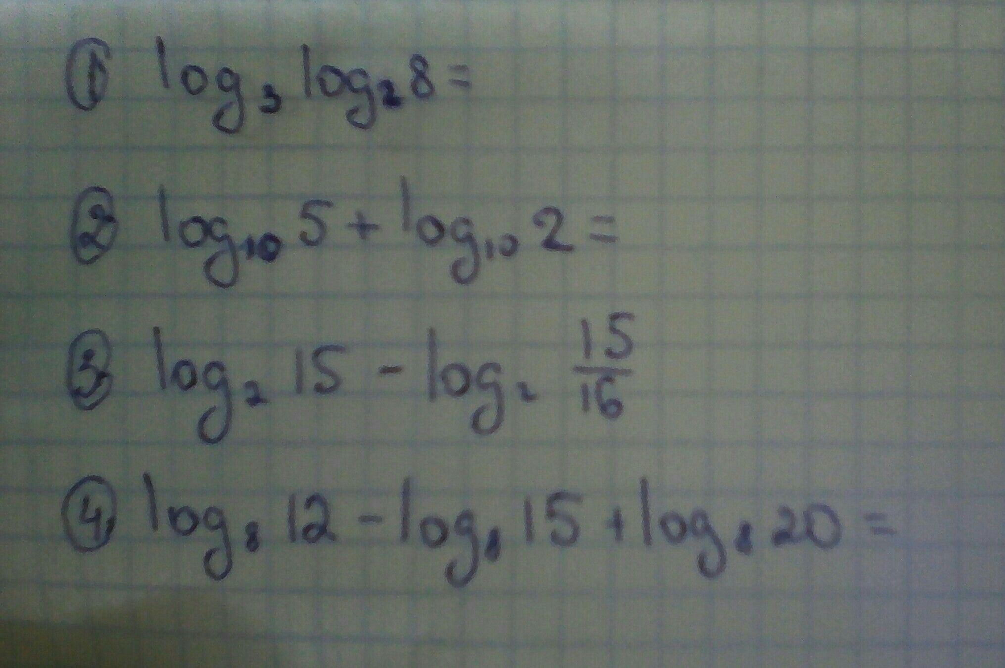 4. log₈12-log₈15+log₈20=log₈(12*20/15)=log₈16=log₂³(2⁴)=(4/3)*log₂2=4/3.