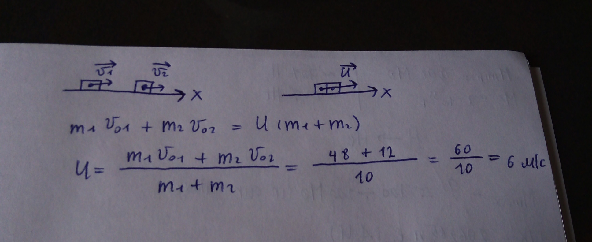 Два неупругих шара массами 6кг и 4 кг движутся со скоростями 8м/с и 3м/с соответственно, направленными вдоль одной прямой . С какой скоростью они будут двигаться после абсолютно неупругого соударения ? Шары движутся навстречу друг другу ( со всеми данными ) пожалуйста.