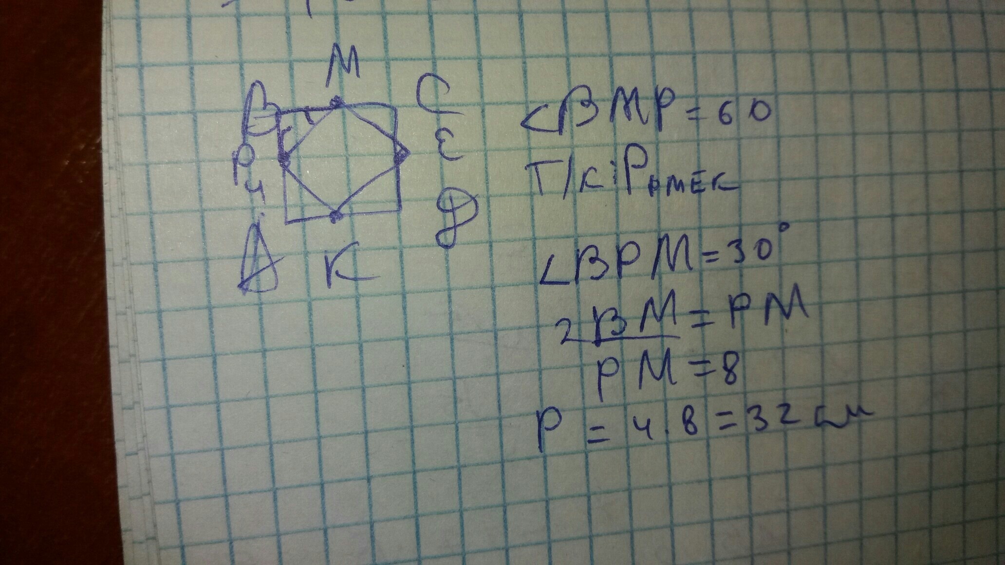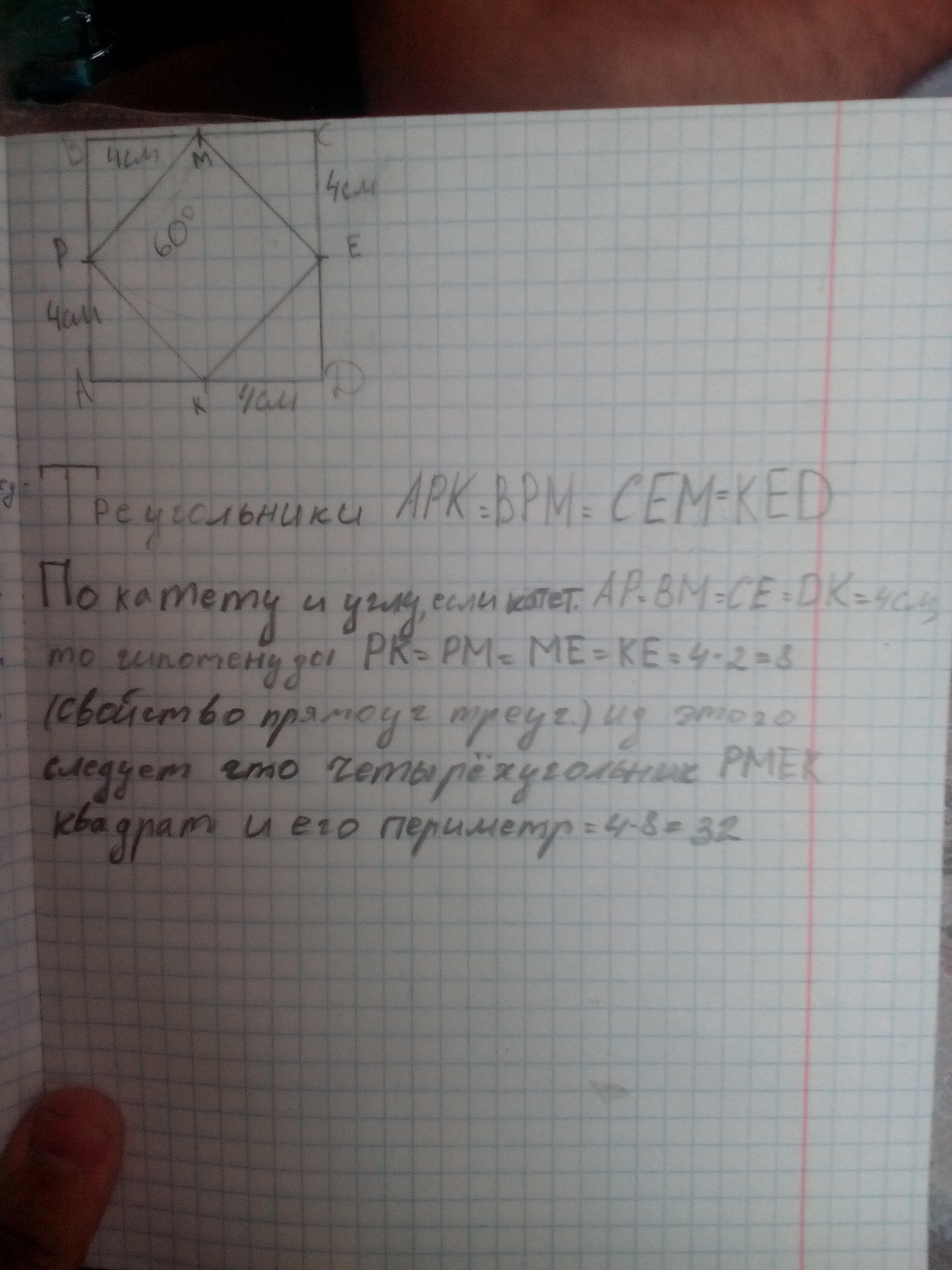 На сторонах AB, BC, CD и AD квадрата ABCD отмечены соответственно точки P, M, E, K так, что AP = BM = CE = DK = 4см, угол BMP = 60 градусов. Чему равен периметр четырехугольника PMEK? Пожалуйста, если возможно, с чертежом.