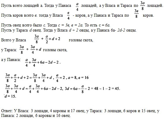У Власа, Тараса и Панаса было поровну голов скота: лошадей, коров и овец. У трех вместе лошадей в два раза меньше, чем коров, а коров в три раза меньше чем овец. Лошадей к Власа и Тараса поровну, а у Панаса в четыре раза меньше, чем у трех вместе. Коров у Тараса и Панаса поровну, а у Власа коров в три раза меньше, чем у Тараса и Панаса у обоих вместе; овец у Власа было двумя больше, чем у Тараса. Сколько всего было у кого овец, коров и лошадей?