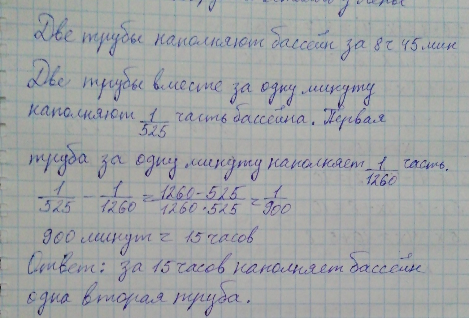 Т.е. вторая труба за 1 час наполнит 1/15 бассейна, следовательно весь бассейн она наполнит за 15 часов
