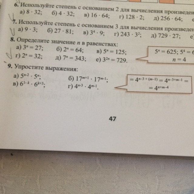 Пояснение: чтобы решить эти примеры, необходимо сложить показатели степеней.