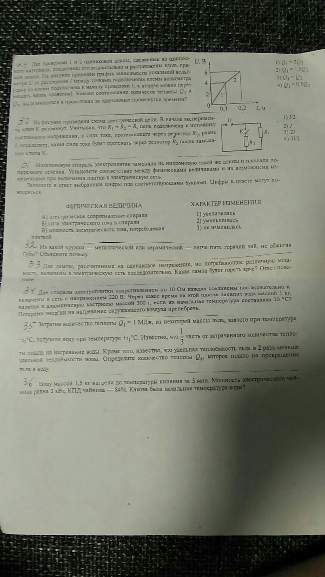 Две проволки 1 и 2 одинаковой длины сделаны из одинакого материала соеденены последовательно и расположены вдоль прямой линии. На рисунке приведён график зависимости показаний врльтметра метра U от расстояния I между точками подключения клемм вольтметра. Каково отношения теплоты Q 1 и Q2 , выделяющихся в проволках за одинаковые промежутки времени?
