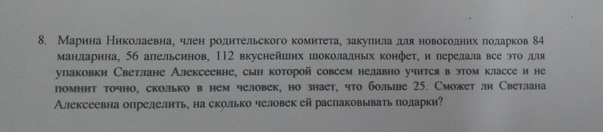 Значит в классе 28 учеников. Каждый получит 2 апельсина, 4 конфеты и 3 мандарина. При этом 2 мандарина останется.