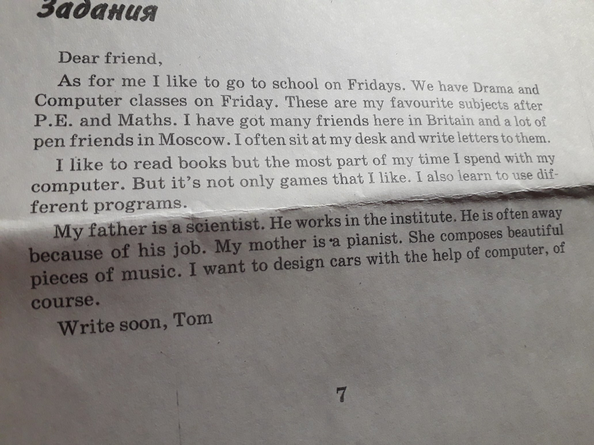 Это для тебя,я люблю ходить в школу в Пятницу.У нас в Пятницу Театральные и Компьютергые классы.Мои любимые предметы это Физическая культура и математика. У меня есть много друзей здесь в Британии и много одноклассников в Москве. Я часто сижу за своим письменным столом и пишу письма тебе.Я люблю читать книги,но большую часть времяни я трачу на компьютер. Но я не только играю в него.Я таже использую разные программы. Мой папа.... Он работает в институте. Он часто уезжает, потому что работает.Моя мама пианист.Она играет чудесные музыкальные пьесы.Я хочу... машины с помощью компьютера, например.