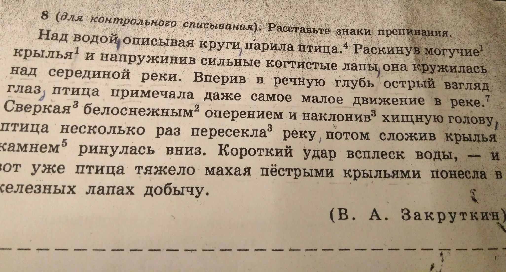 Над водой, ОПИСЫВАЯ КРУГИ, парила птица. РАСКИНУВ МОГУЧИЕ КРЫЛЬЯ И НАПРУЖИНИВ СИЛЬНЫЕ КОГТИСТЫЕ ЛАПЫ, она кружилась над серединой реки. ВПЕРИВ В РЕЧНУЮ ГЛУБЬ ОСТРЫЙ ВЗГЛЯД ГЛАЗ, птица примечала даже самое малое движение в реке. СВЕРКАЯ БЕЛОСНЕЖНЫМ ОПЕРЕНИЕМ И НАКЛОНИВ ХИЩНУЮ ГОЛОВУ, птица несколько раз пересекла реку, потом, СЛОЖИВ КРЫЛЬЯ, камнем ринулась вниз. Короткий удар, всплеск воды, - и вот уже птица, ТЯЖЕЛО МАХАЯ ПЁСТРЫМИ КРЫЛЬЯМИ, понесла в железных лапах добычу...Деепричастные обороты выделены заглавными буквами.