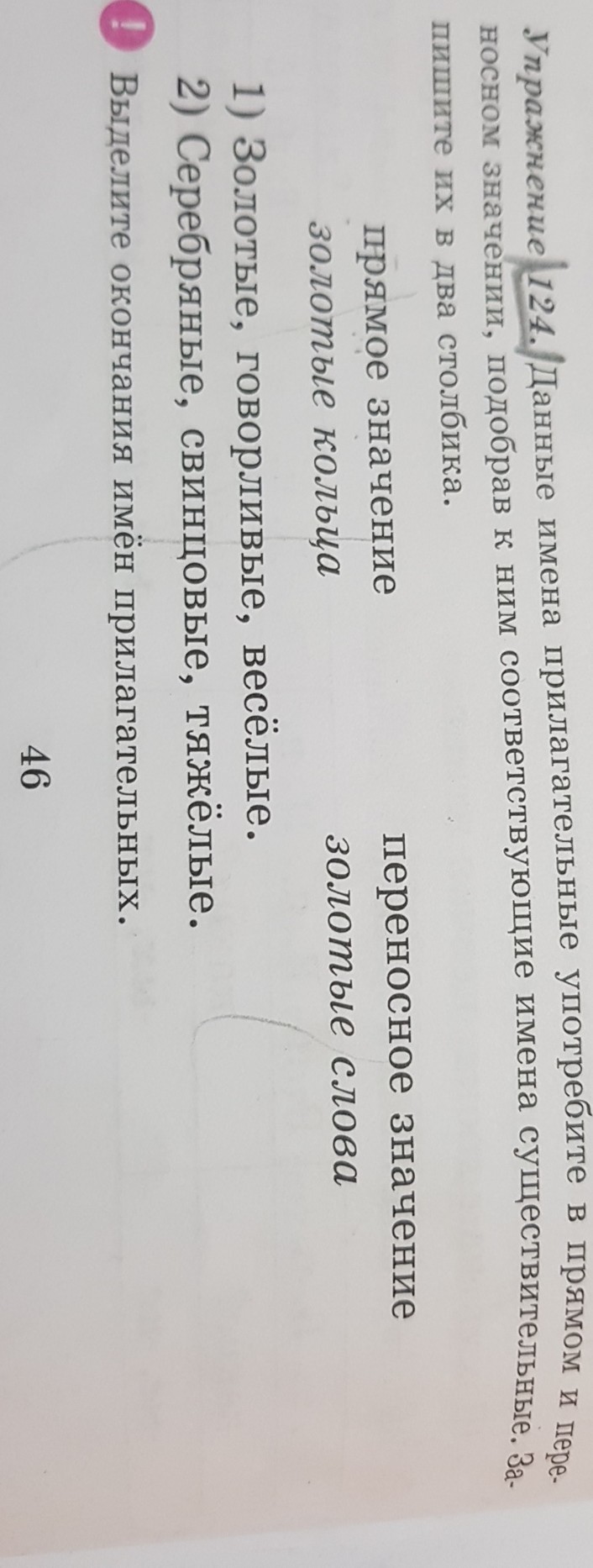 Золотые украшения (прям.), золотые руки (перен.), говорливые девочки (прям.), говорливые ручейки (перен.), весёлые дети (прям.), весёлые каникулы (перен.)