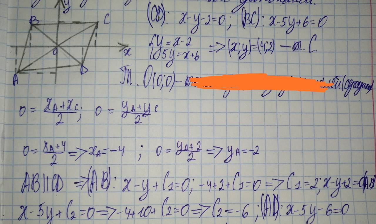 x-5y+6=0, x-y-2=0. Диагонали его пересекаются в начале координат. Написать уравнения двух других сторон параллелограмма.