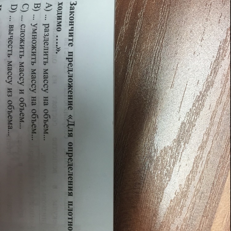 Закончите предложение "Для определения плотности вещества необходимо ... " а)..разделить массу на объём . В) .. умножить массу на объём . С) ..сложить массу на объём . Д) .. вычесть массу из объема