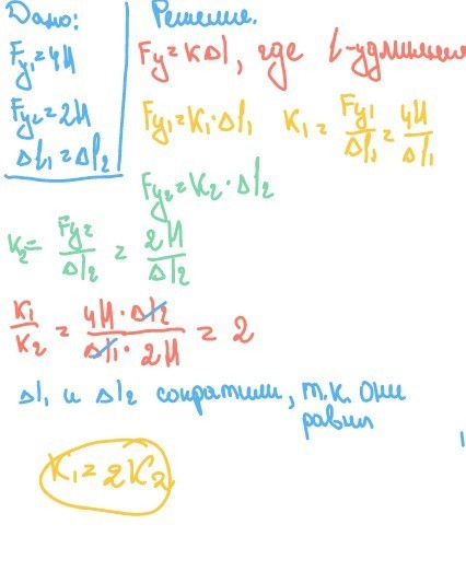 Имеются две абсолютно упругие пружины к первой пружине приложена сила 4 Н, а ко второй 2Н. При этом удлинения пружин оказались равными. Сравните жесткость k1 первой пружины с жесткостью k2 второй пружины