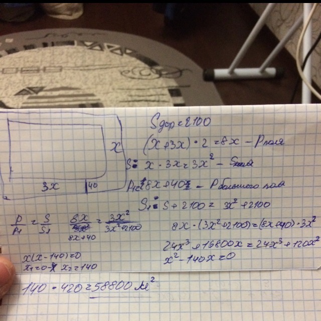 Футбольное поле в форме прямоугольника, длина которого в 3 раза больше ширины, окружено со всех сторон дорожкой одинаковой ширины. Разность между длиной наружной и внутренней границ дорожки составляет 40 м, а площадь дорожки равна 2100 м2. Определите площадь футбольного поля..