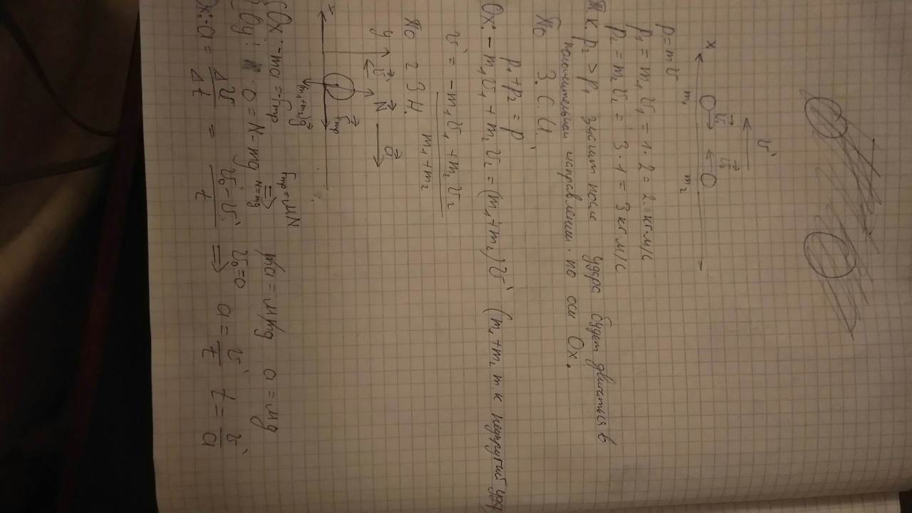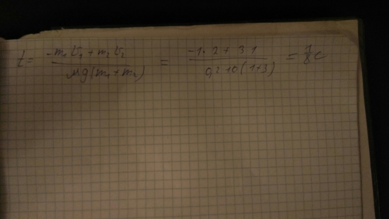 t = v/a = ((m2•v2 - m1•v1)/(m1 + m2))/(μ•g) = (m2•v2 - m1•v1)/((m1 + m2)•μ•g) = (3•1 - 1•2)/((1 + 3)•0,2•10) = (3 - 2)/(4•2) = 1/8 c = 0,125 c.