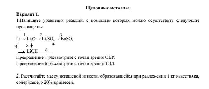 1) 4Li + O2 = 2Li2O (с точки зрения ОВР: в ходе данной реакции атомы лития отдают один электрон кислороду, проявляя с.о. +1, а кислород принимает по электрону от каждого лития, проявляя степень окисления -2. Изначально и литий, и кислород имели с.о. 0)