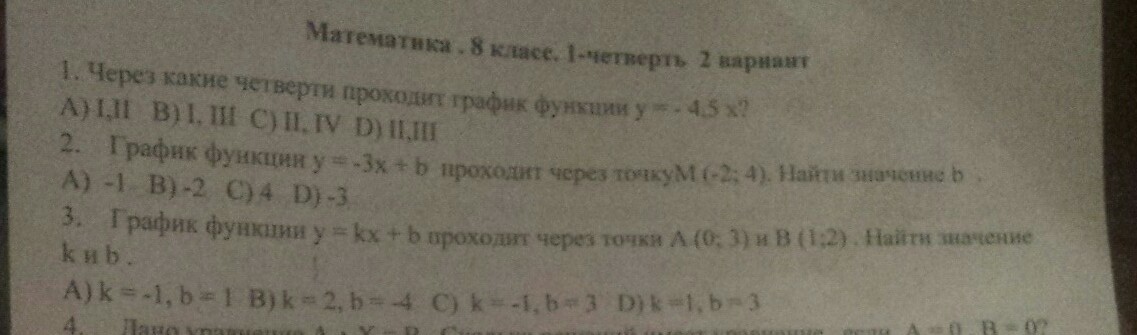 1) Если коэффициент a отрицательный, b=0, то (2 и 4) четверти. Ответ С.