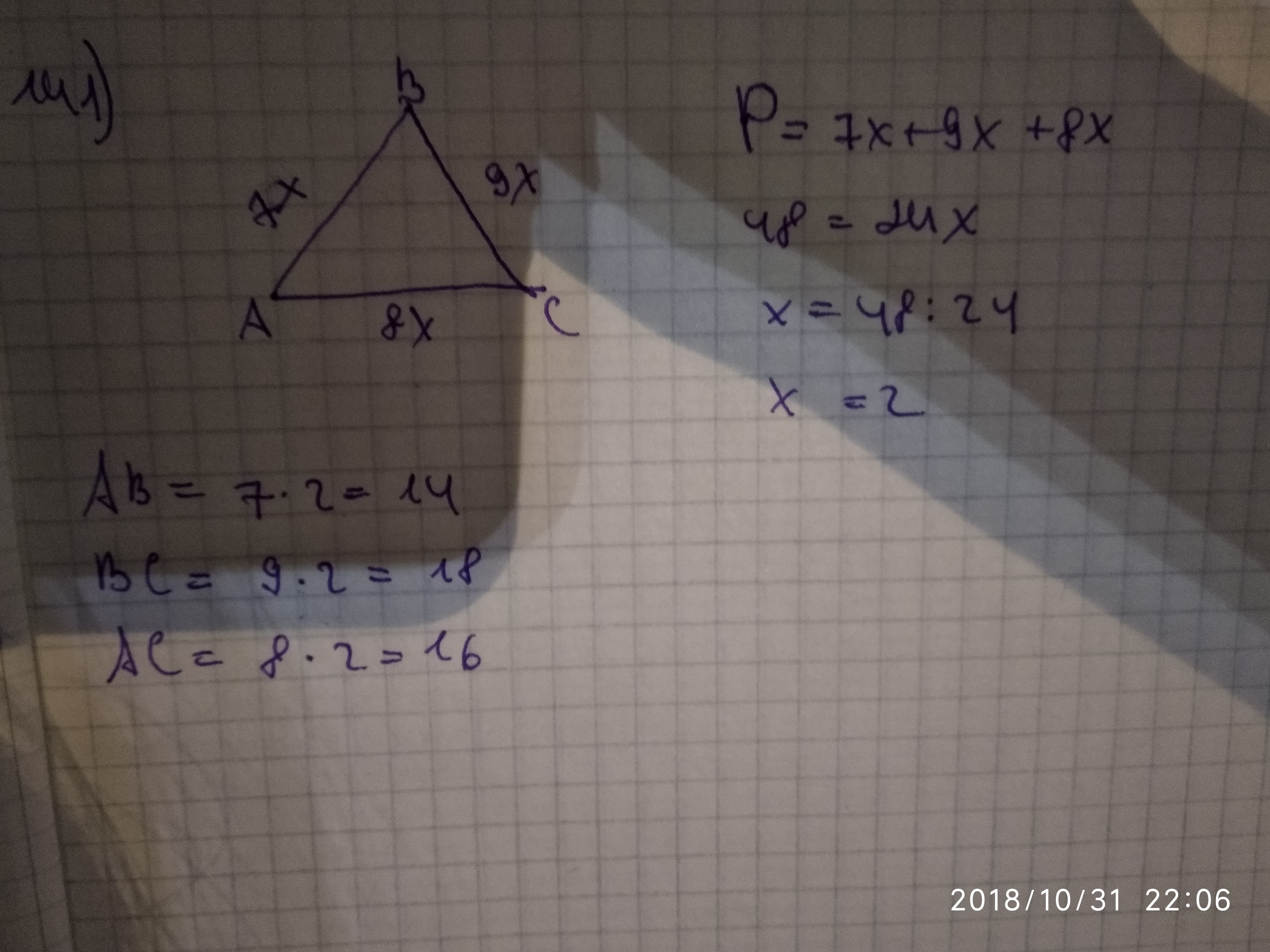 А что там непонятно?Пусть АВ=7х ВС=9х АС=8х и ищем