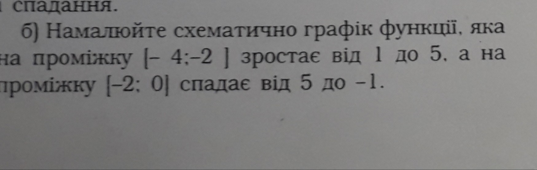 Намалюйте схематично графік функції яка на проміжку [-4;-2] зростає від 1 до 5. а на проміжку [-2;0] спадає від 5 до -1