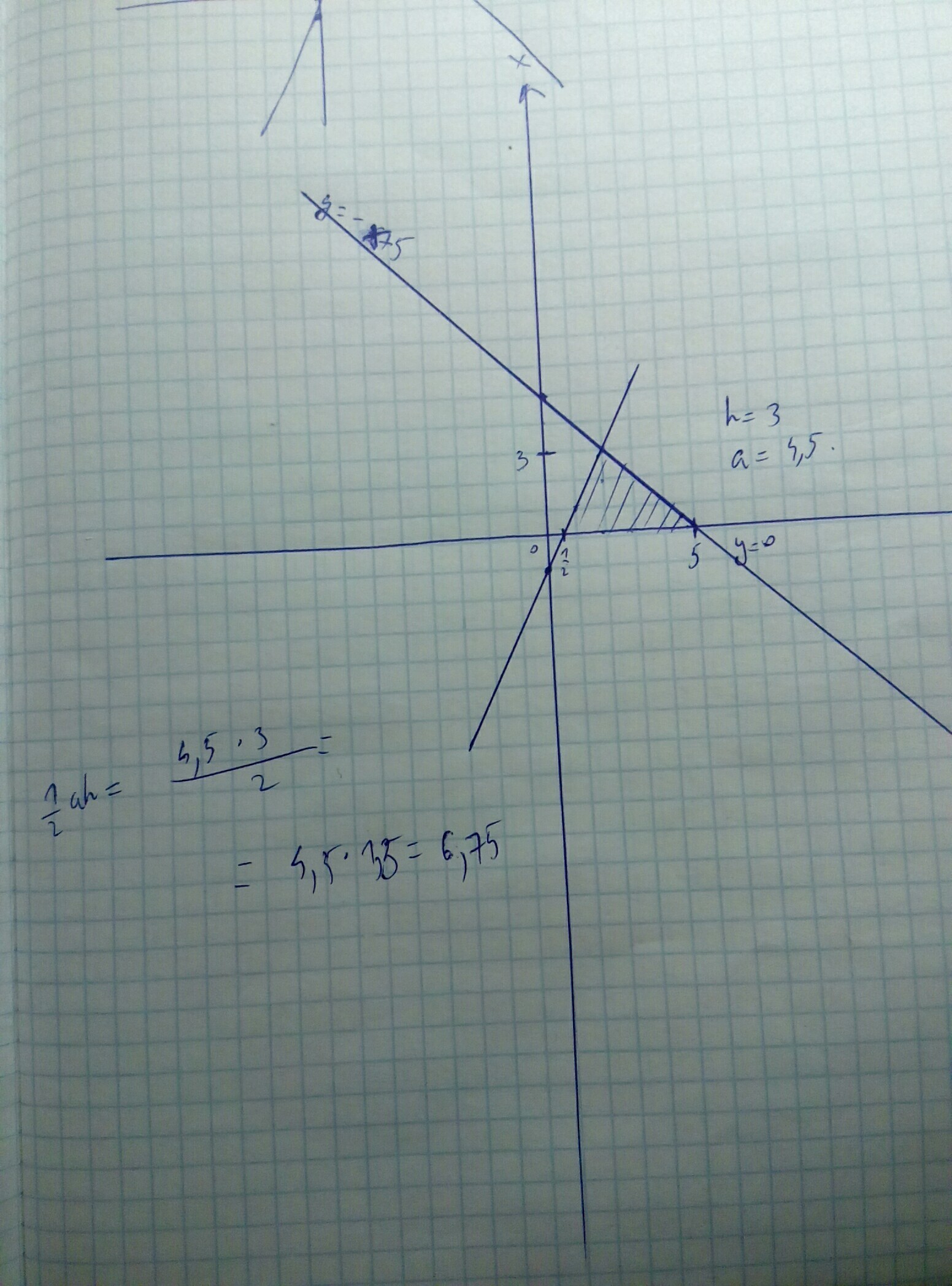 Строим все прямые , фигура треугольник находим высоту находим сторону и по формуле 1/2ah находим площадь в итоге s=6,75