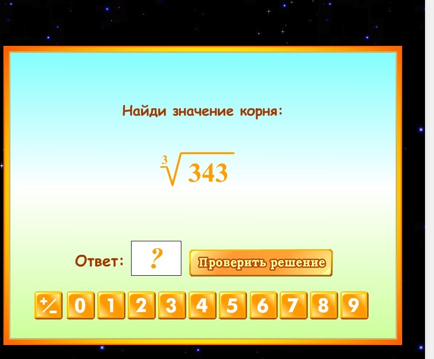 (343)^1/3=7. Ответ: 7. ^1/3-корень кубический.
