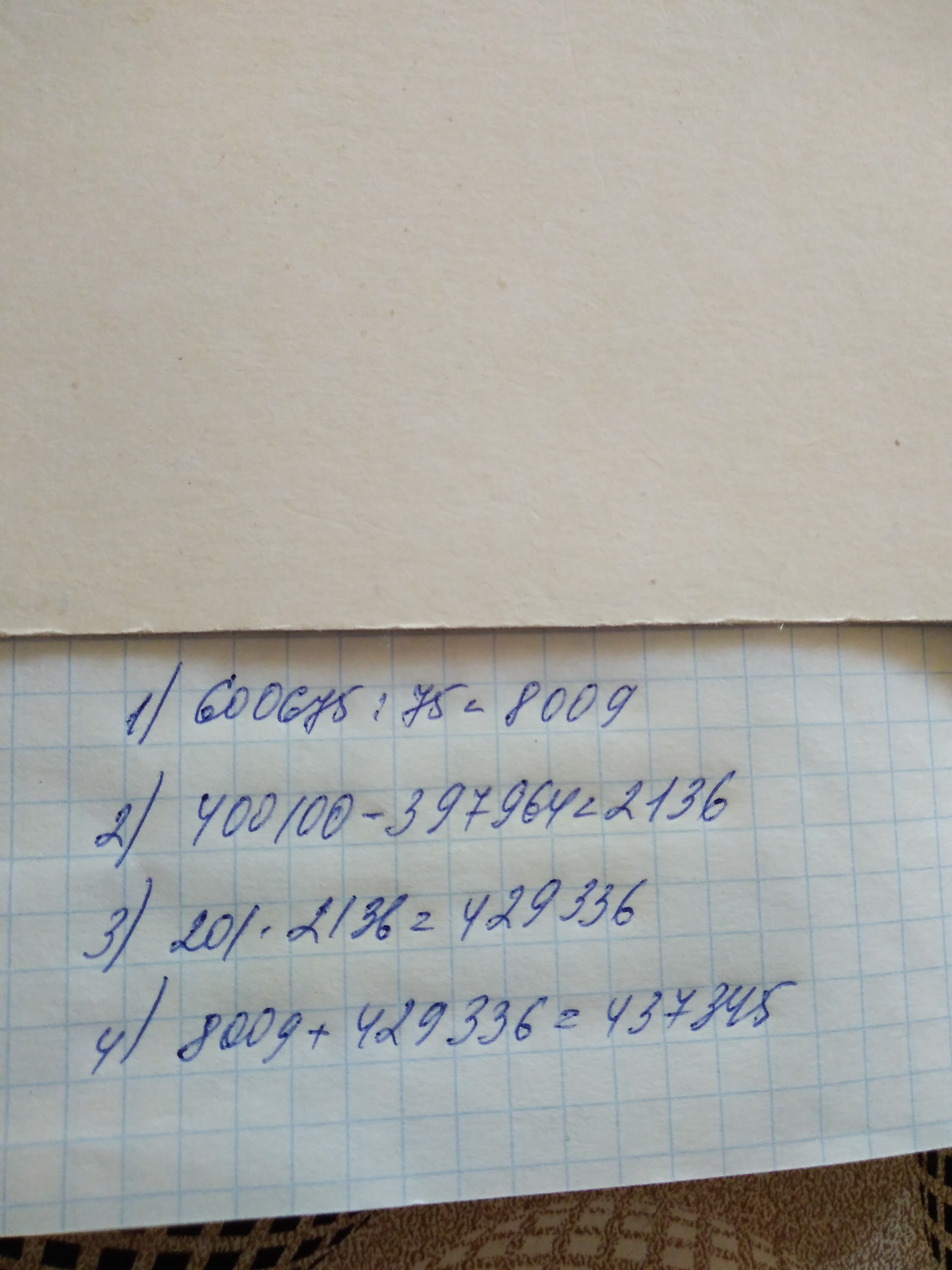 600675:75+201*(400100-397964)=600675:75+201*2136=8009+201*2136=8009+429336=437345