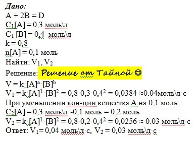 Реакция между веществами А и В выражается уравнением А + 2В = D. Начальные концентрации (моль/л):СА = 0,3 иСВ = 0,4. Константа скорости равна 0,8. Вычислить начальную скорость реакции и определить, как изменилась скорость реакции по истечении некоторого времени, когда концентрация вещества А уменьшилась на 0,1 моль.