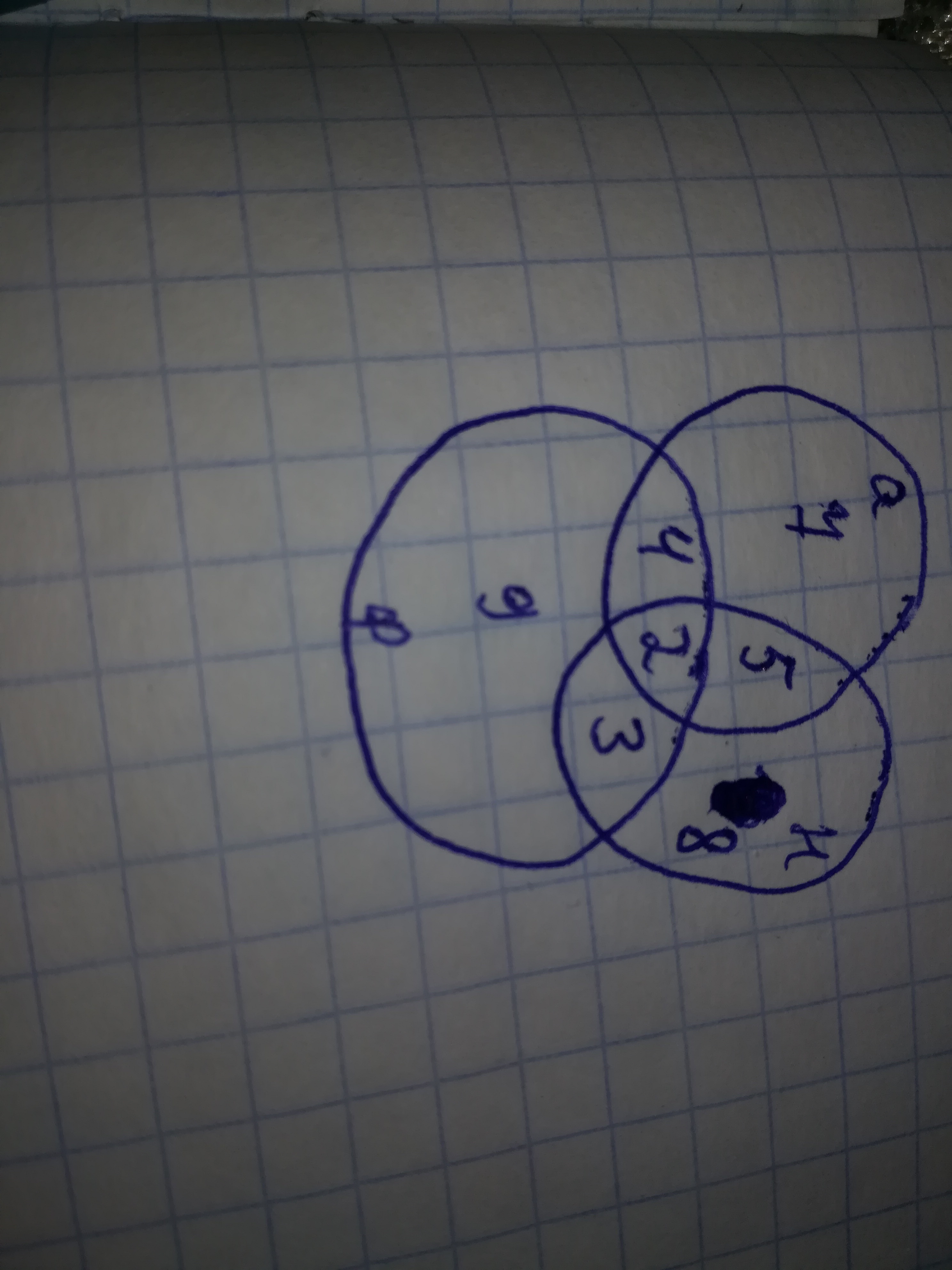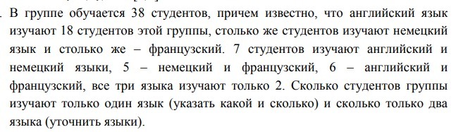 Нарисуем 3 окружности, пересекающиеся между собой. Каждая окружность соответствует одному языку. Пересечение трех окружности, это те кто изучают все три языка (их 2). Пересечение двух окружности это те кто изучают соответственно эти два языка. Например, английский и немецкий в общем изучают 7 человек, отнимаем от них 2 и получаем количество людей, которые изучают ТОЛЬКО английский и немецкий и так с каждыми. В итоге получаем ответ: только английский изучают 7, только немецкий - 8, только французский - 9. Только английский и немецкий - 5, только английский и французский - 4, только немецкий и французский - 3.